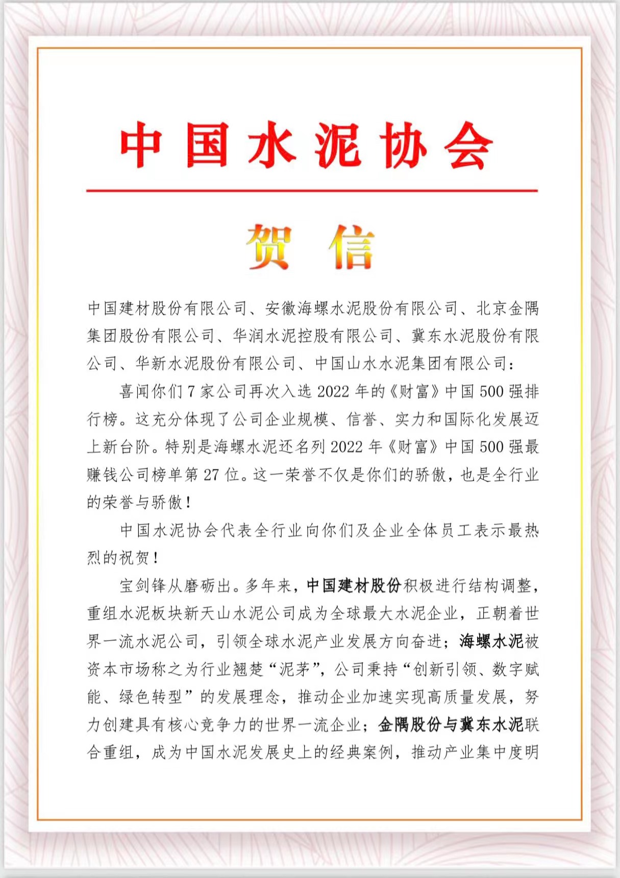 中國水泥協(xié)會(huì)賀信