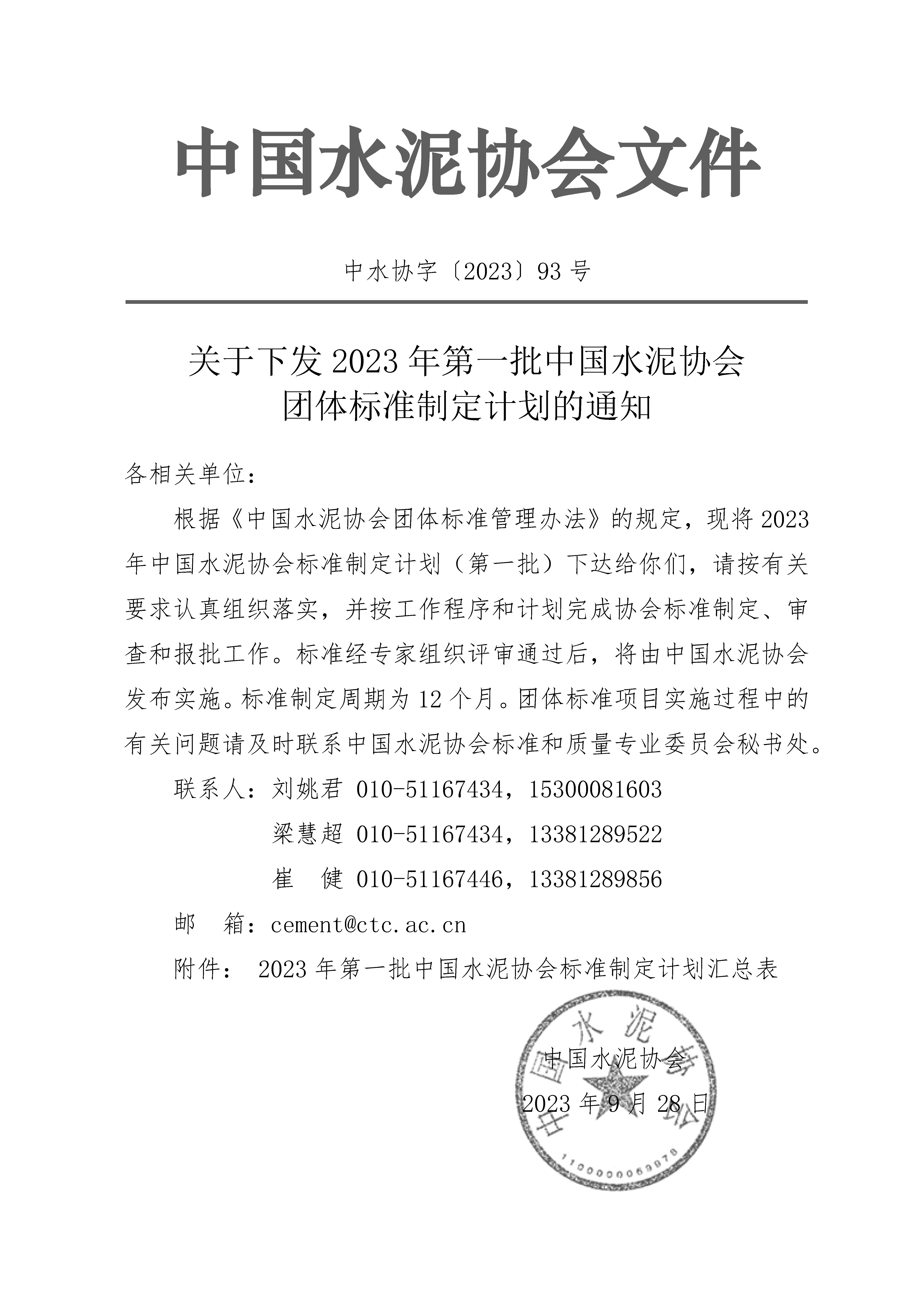 關于下發(fā)2023年第一批中國水泥協(xié)會團體標準制定計劃的通知